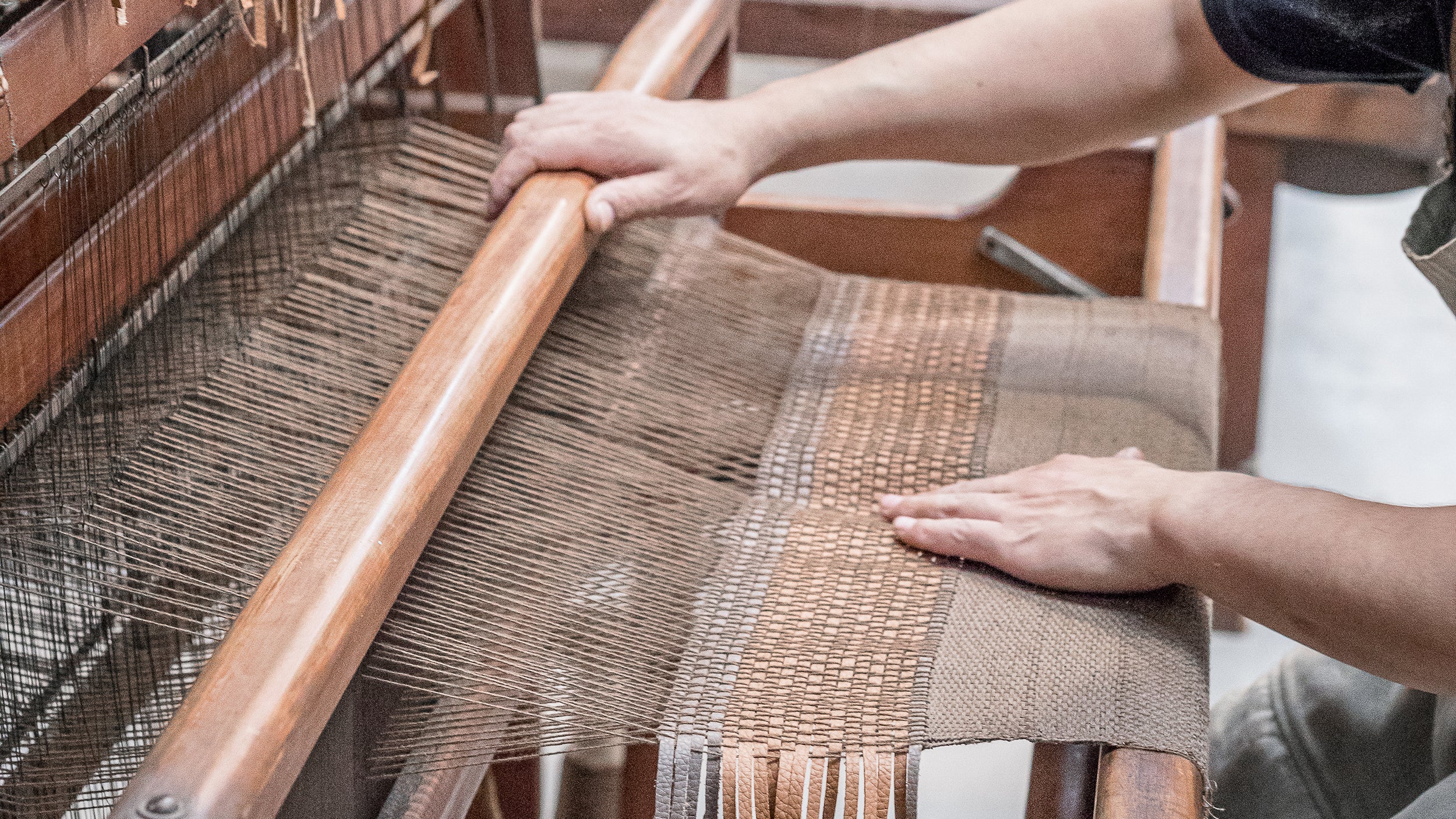 Fine strips of leather are meticulously cut by hand and then woven over a cotton warp on a small antique loom. This exceptional craftsmanship is then applied to our collection of bags and interior projects.