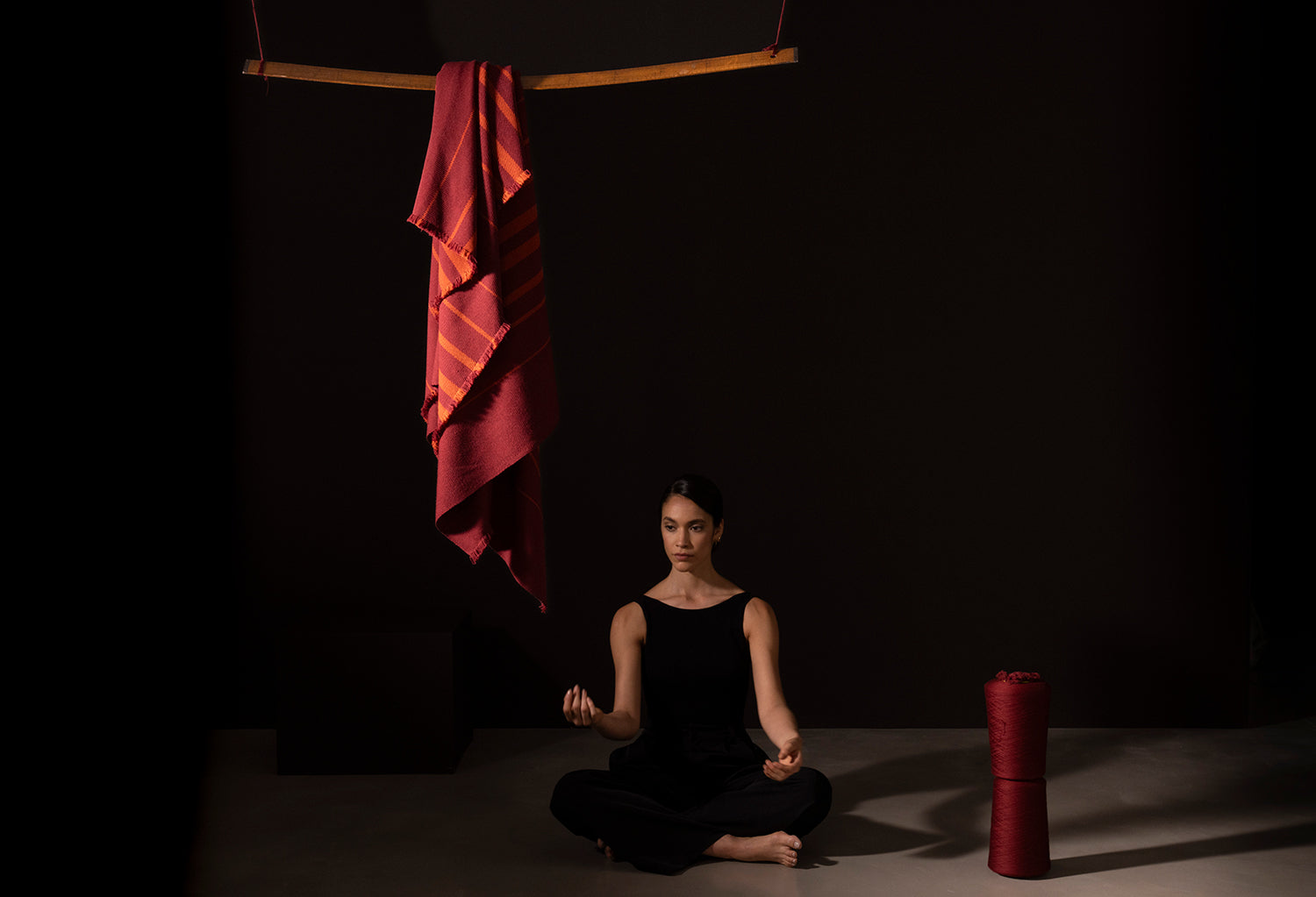 Patagonian merino wool in flame red is criss- crossed by symmetrical orange lines.