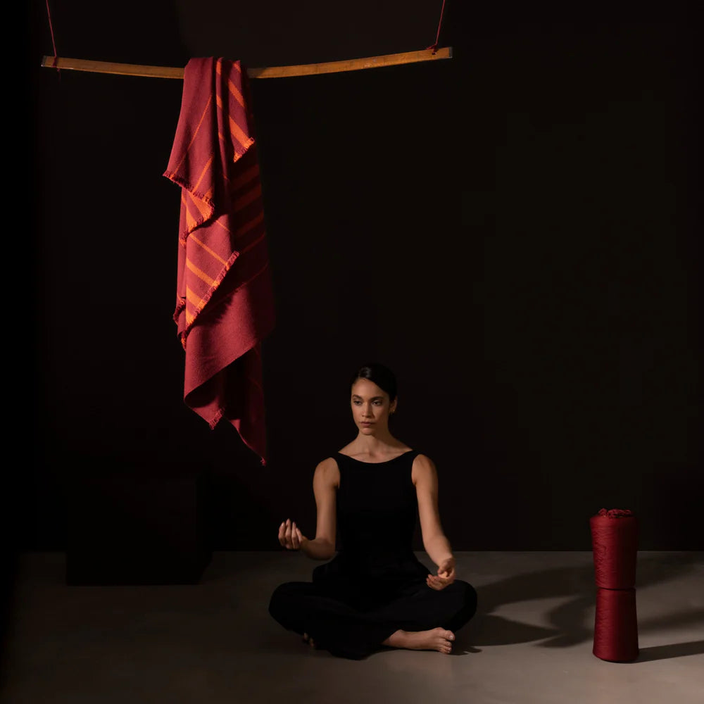 Patagonian merino wool in flame red is criss- crossed by symmetrical orange lines.