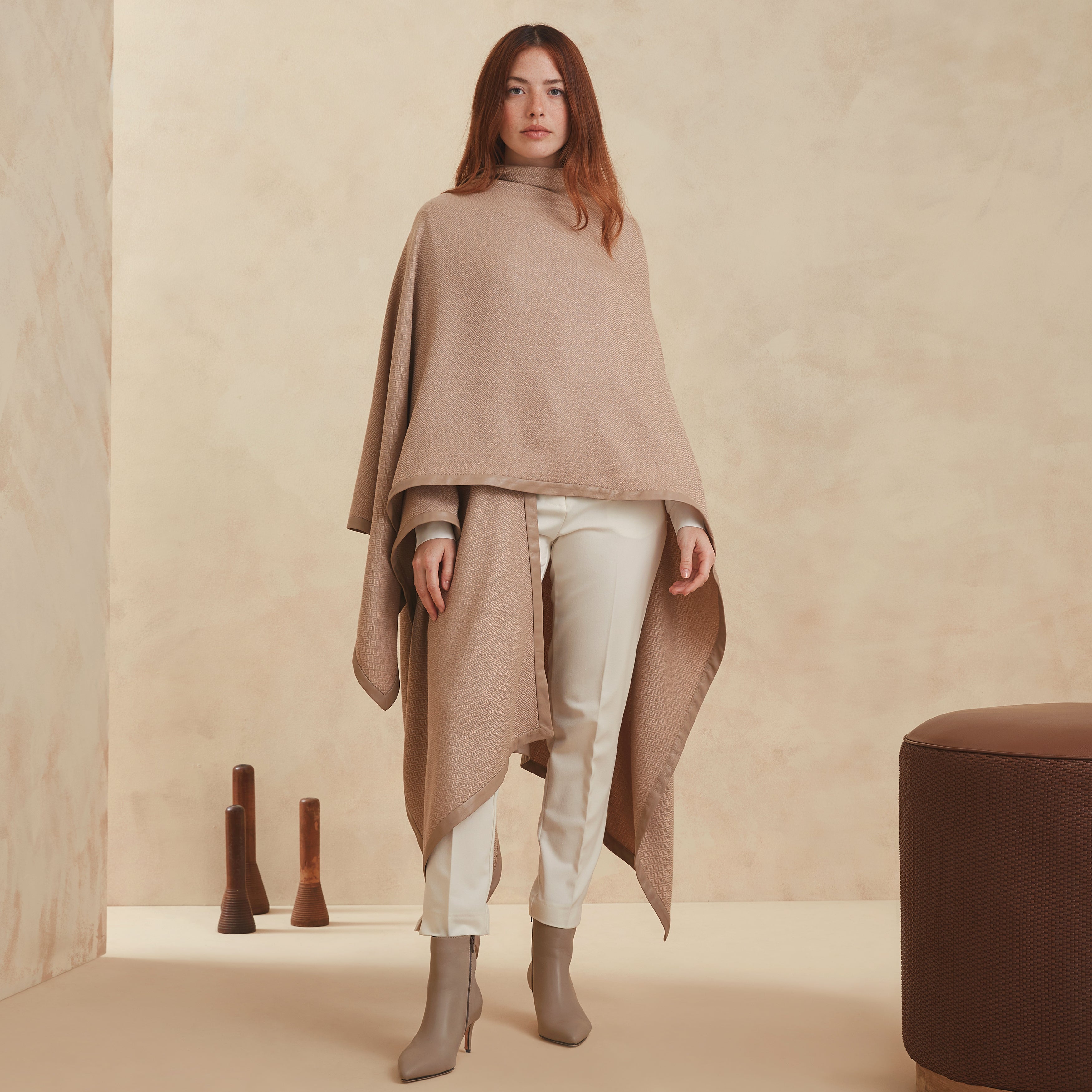 The poncho is made of superfine Patagonian merino wool in a light shade of beige, with a subtle herringbone pattern and a delicate handmade embroidery made with guanaco fiber.