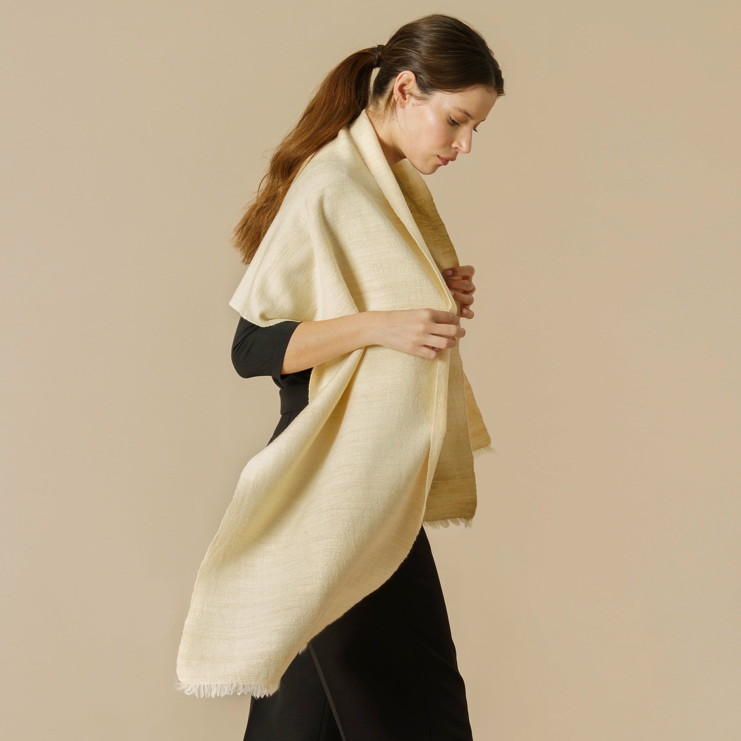 The cape Kai was made in hand-looms from the 19th century in our textile mill with artisanal techniques.
