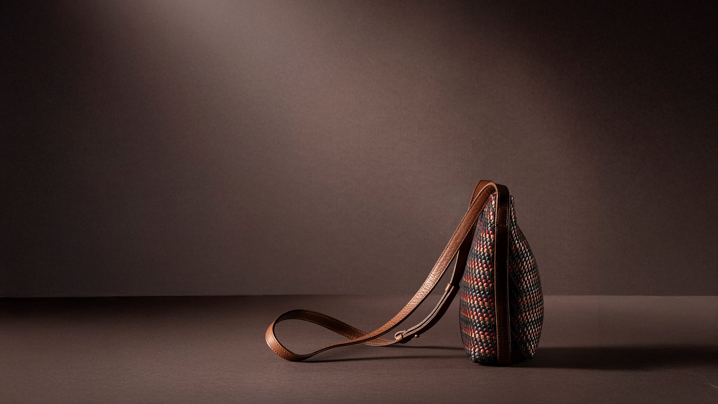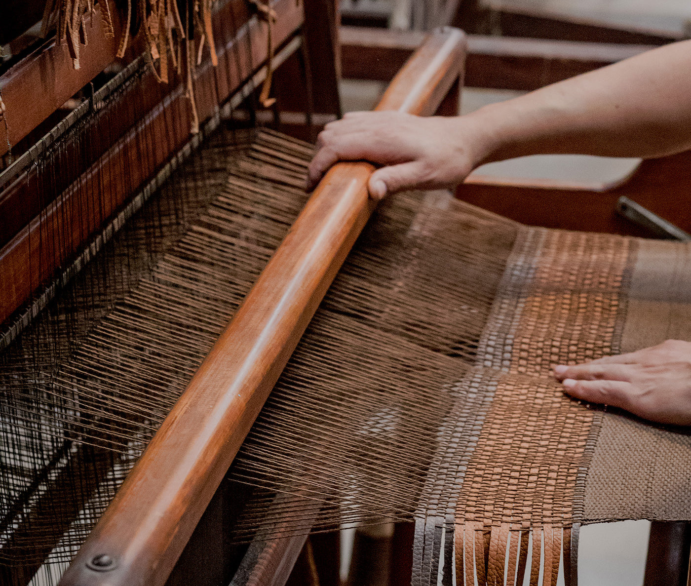 Fine strips of leather are meticulously cut by hand and then woven over a cotton warp on a small antique loom. This exceptional craftsmanship is then applied to our collection of bags and interior projects.