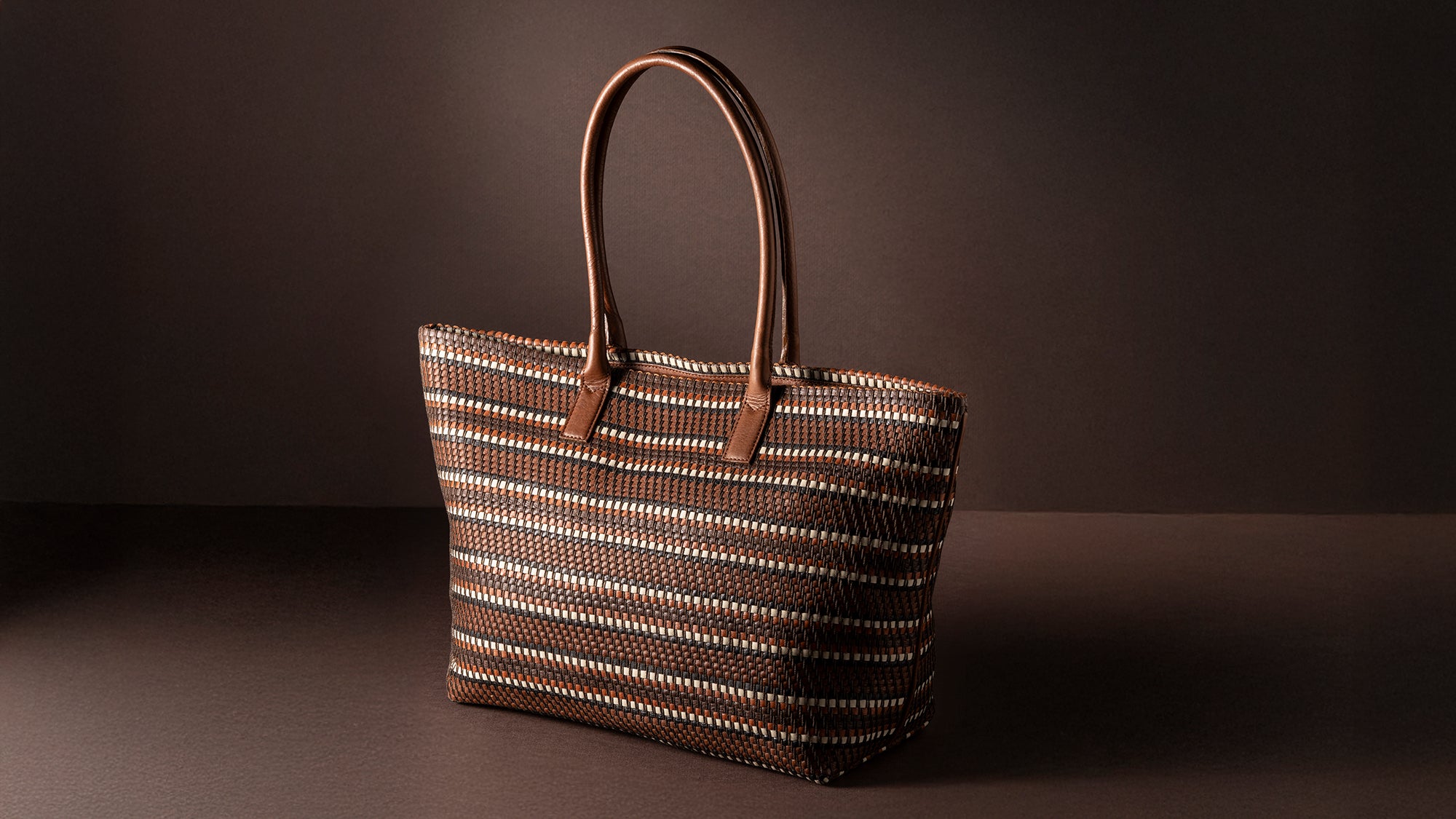 Fine strips of leather are meticulously cut by hand and then woven over a cotton warp on a small antique loom.