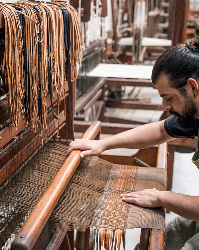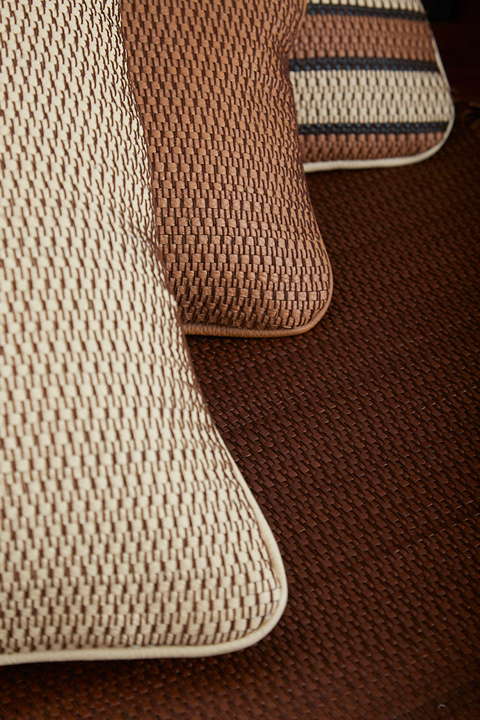 The first step of this technique is hand-cutting fine strips of leather. The pattern is then woven over a cotton warp in a small and antique loom, where only one or two meters can be made each day. A unique and sophisticated texture with a strong identity is thus created, and then applied to different design objects, such as chairs, armchairs, cushions, and all kinds of furniture.